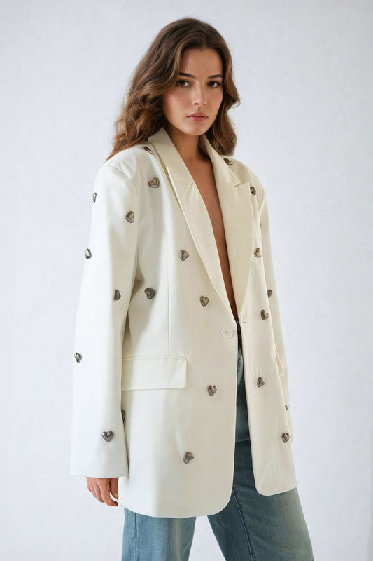 Oversized Blazer with Heart Embellishments - White