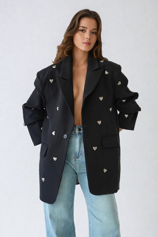 Oversized Blazer with Heart Embellishments - Black