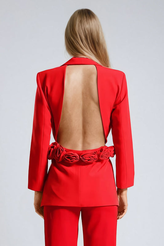 Open-Back Blazer with Floral Detail - Red