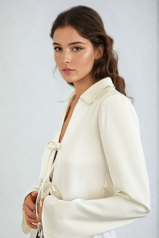 Tie-Front Collared Top with Flared Sleeves - Beige