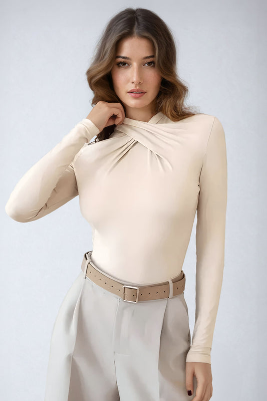 Long Sleeve Twist Front Bodysuit - Beige