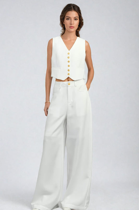 Long Sleeve Jacket with V-Neck Vest and High Waist Trousers Co-Ord Set - White