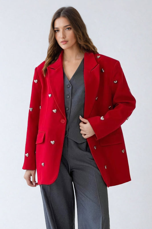 Oversized Blazer with Heart Embellishments - Red