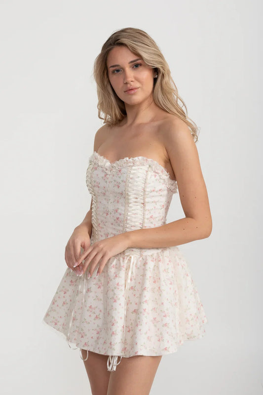 Lace Corset Mini Dress with Flared Skirt and Tie Waist - White