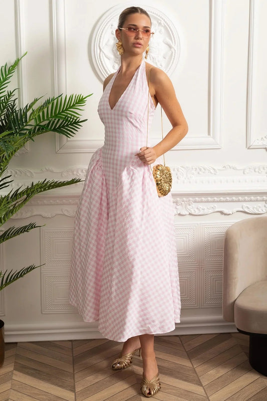 Gingham Halter Midi Dress With Full Skirt - Pink