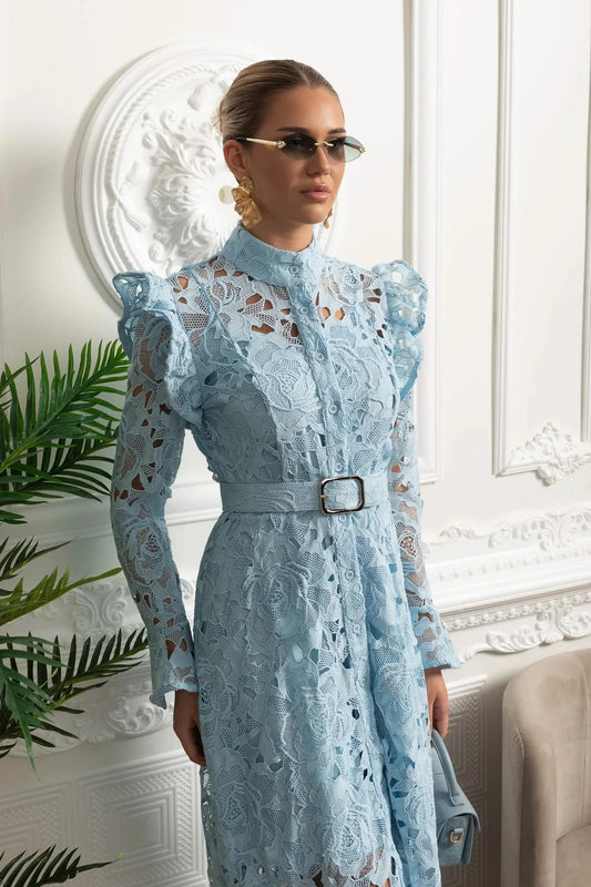 Floral Lace Long Sleeve Belted Shirt Dress - Blue