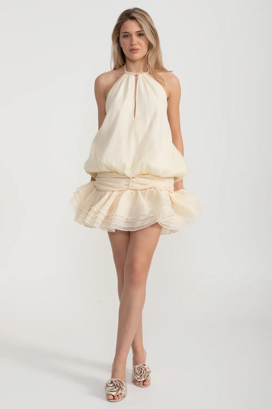 Pearl Halter Puff Dress With Layered Mini Skirt - Ivoire