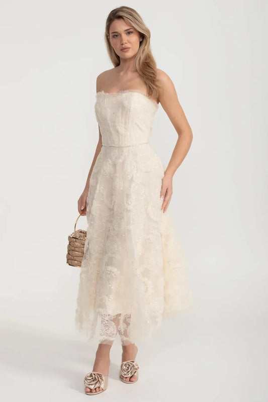 Strapless Lace Midi Dress with Scalloped Hem - Ivoire