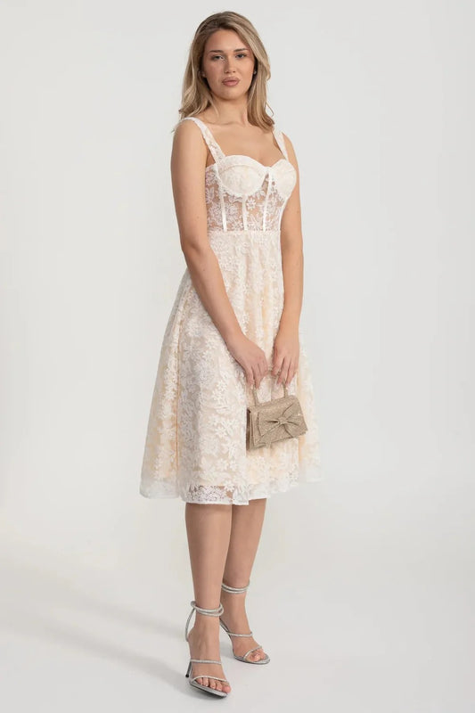Embroidered Lace Midi Dress with Sheer Corset Bodice - Ivoire