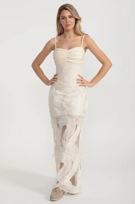 Sheer Appliqué Maxi Dress with Ruched Bodice - Ivoire