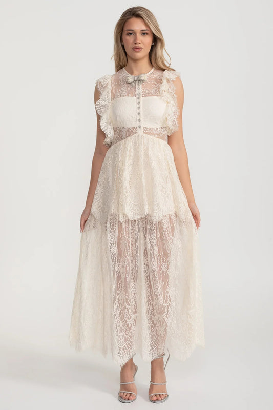 Lace Maxi Dress with Crystal Bow and Sheer Layers - White