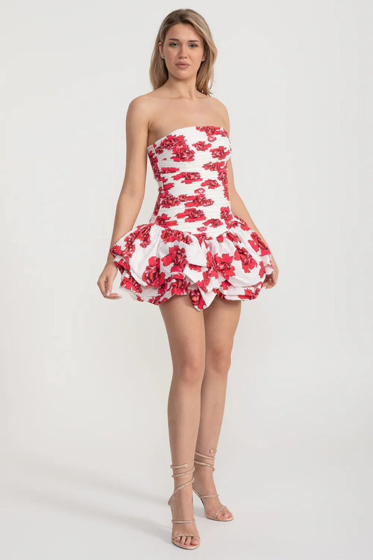 Strapless Ruched Dress with Floral Bubble Skirt - Red