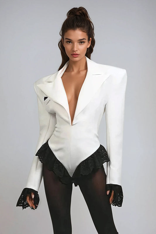 Tailored Bodysuit with Lace Trim and Notched Lapel - White