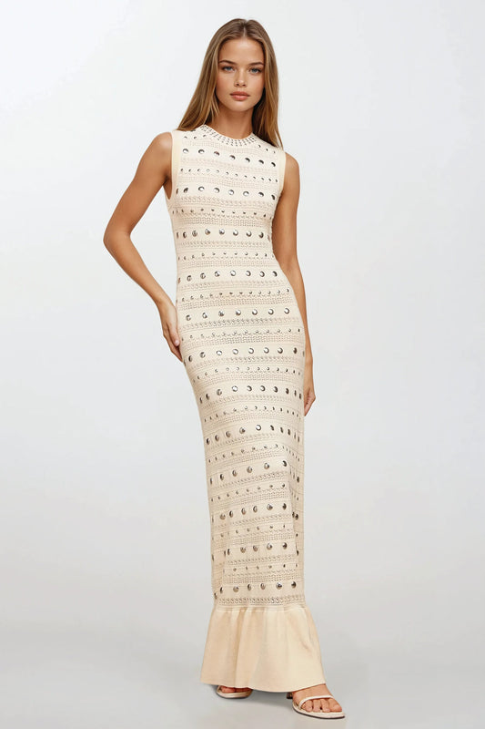 Knitted Sleeveless Maxi Dress with Metallic Accent - Apricot