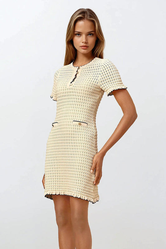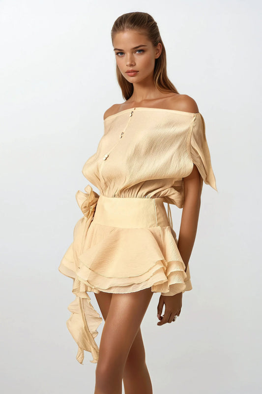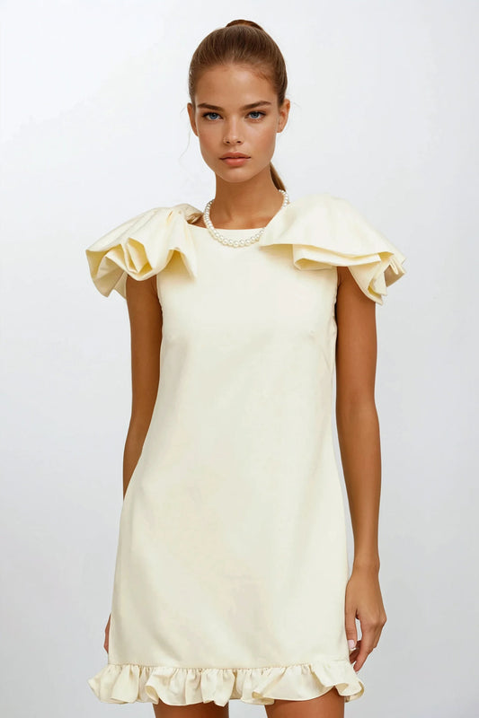 Ruffled Boat Neckline Mini Dress with Ribbon Shoulder Accent - Apricot