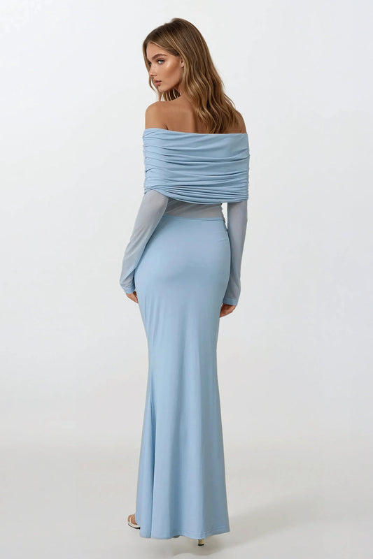Off-Shoulder Longsleeves Ruched Maxi Dress - Blue