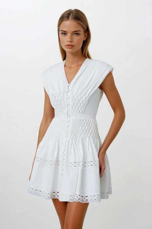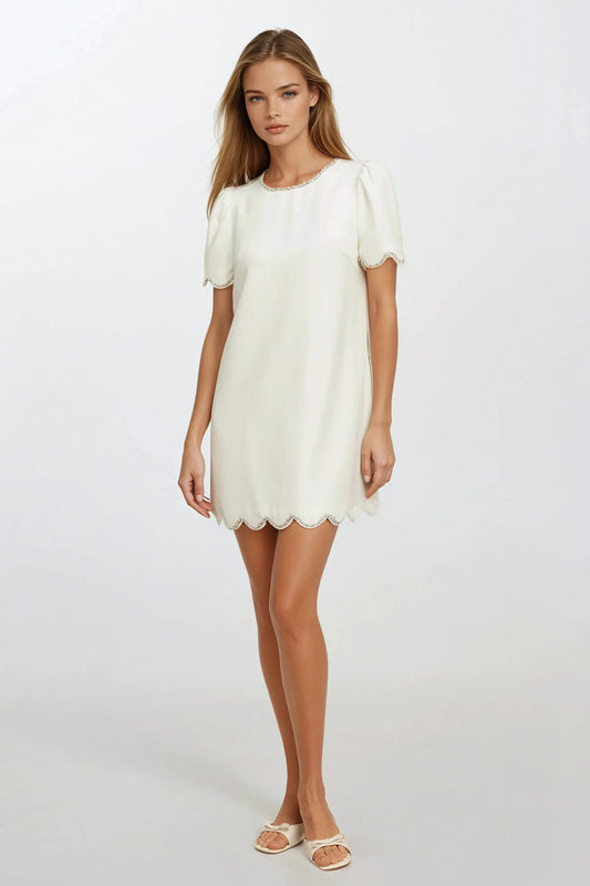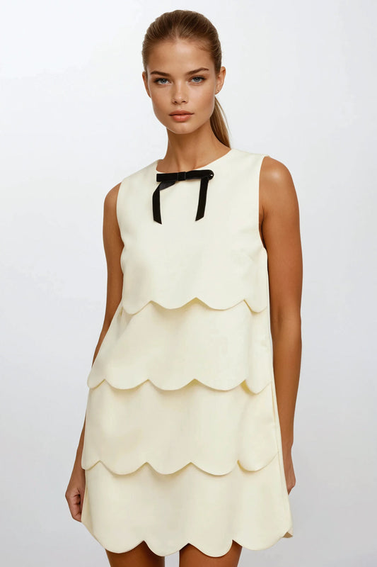 Sleeveless Scalloped Mini Dress with Bow Detail - White