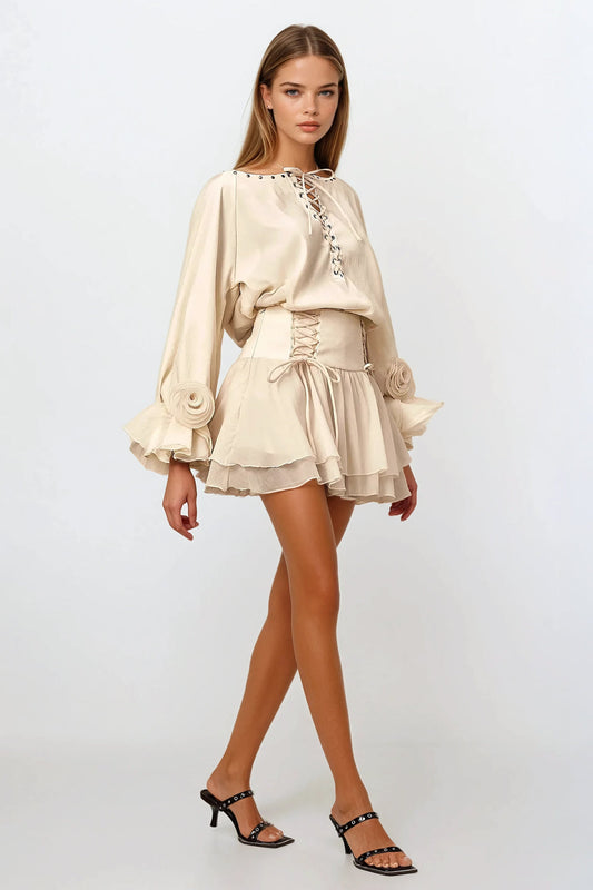 Off-Shoulder Lace-Up Mini Dress - Apricot