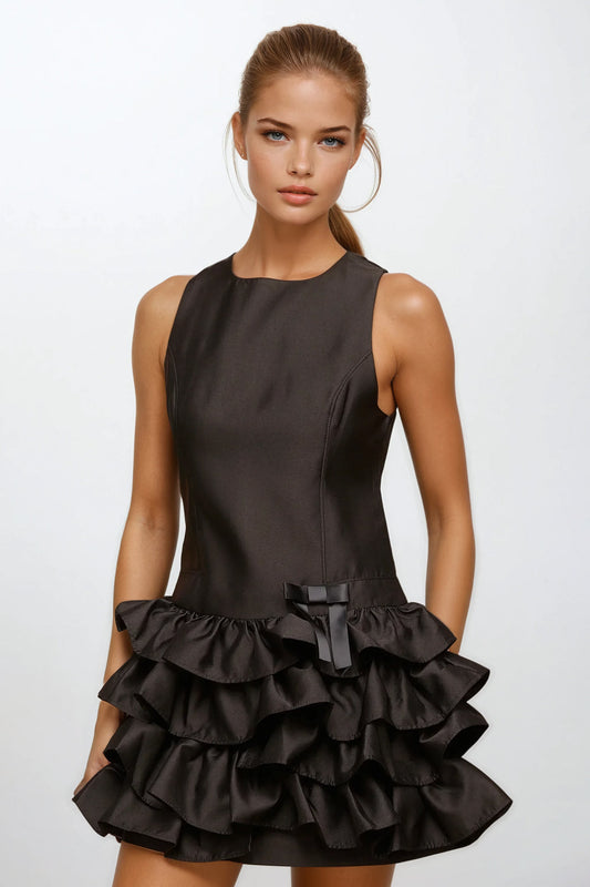 Sleeveless Mini Dress with Layered Ruffle Skirt - Black