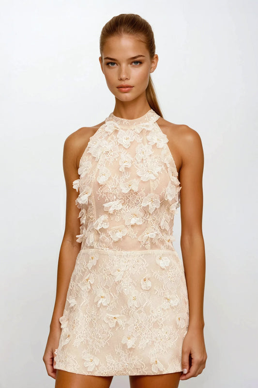 Halter Neck Mini Dress with Floral Lace Detailing - Apricot