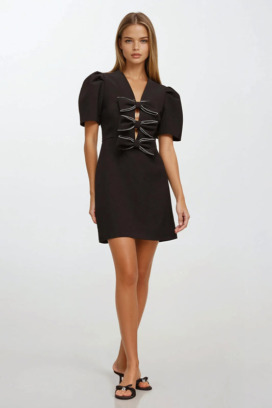 Deep V-Neck Structured Mini Dress with Long Sleeves - Black
