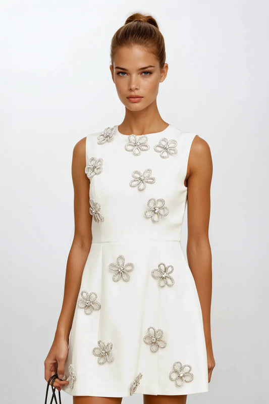 Sleeveless Mini Dress with Beaded Floral Accents - White