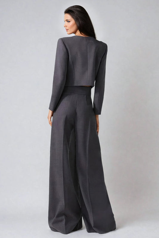 Cropped Blazer with Round Neckline and Gold Button Details - Gray