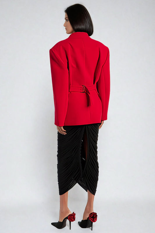 Double-Breasted Blazer with Notched Lapels and Belted Waist - Red