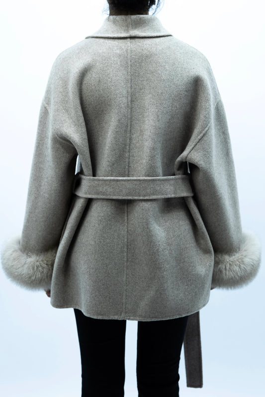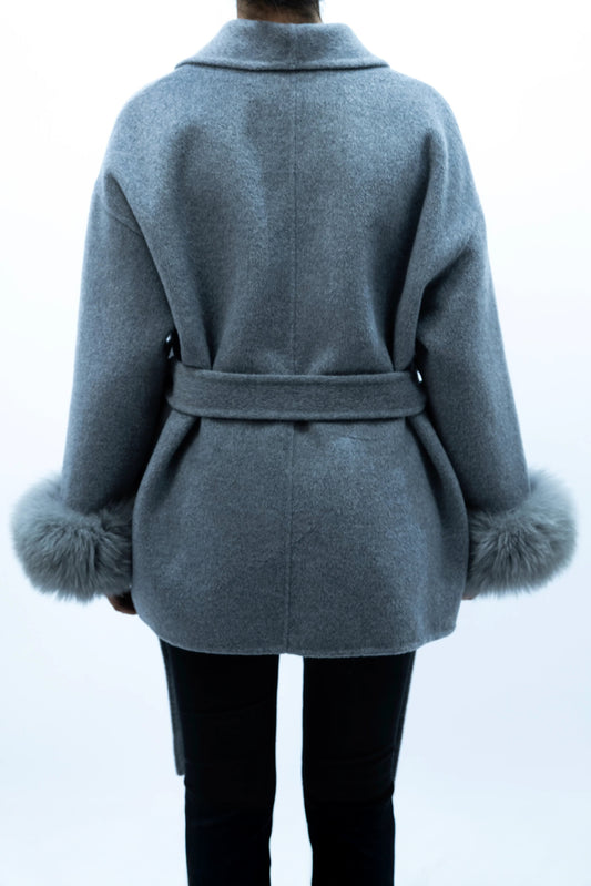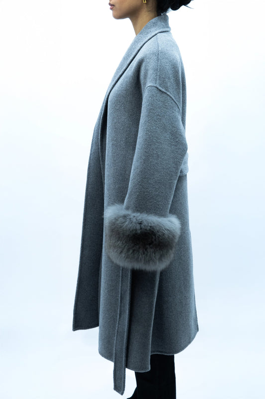 100% Wool Belted Coat with Fur Cuffs - Gray
