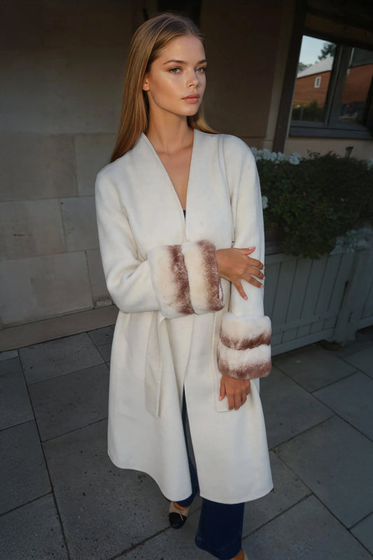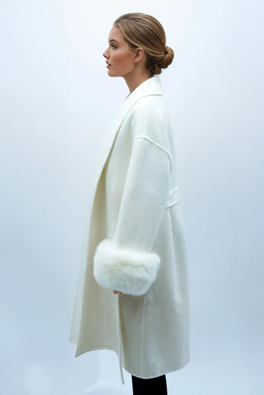100% Wool Belted Long Coat with Fur Cuffs - White