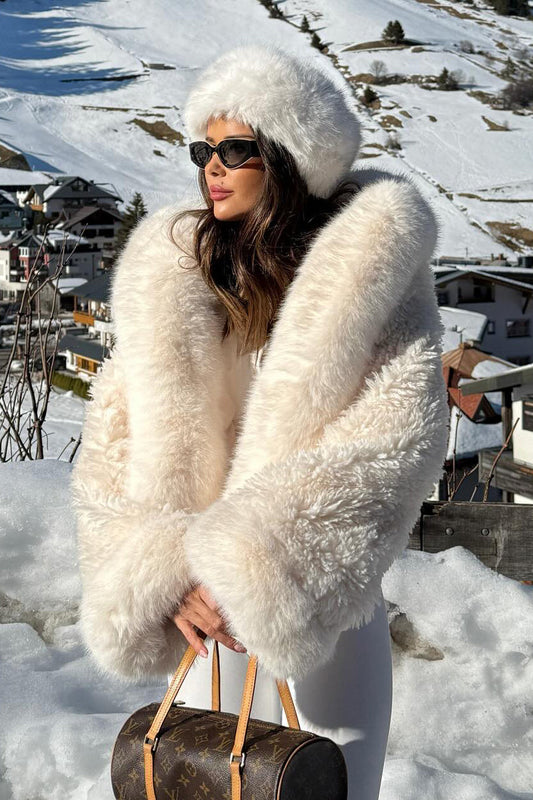 100% Wool Coat with Wide Collar and Fur Cuffs - White