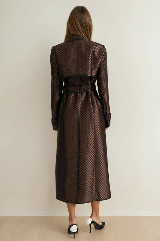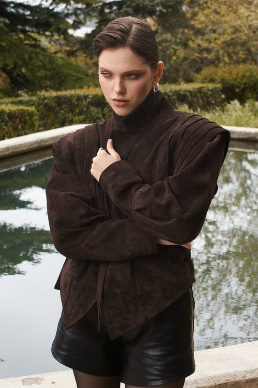 Wrap Front Jacket with Wide Shoulders and Lace-Up Detail - Dark Brown