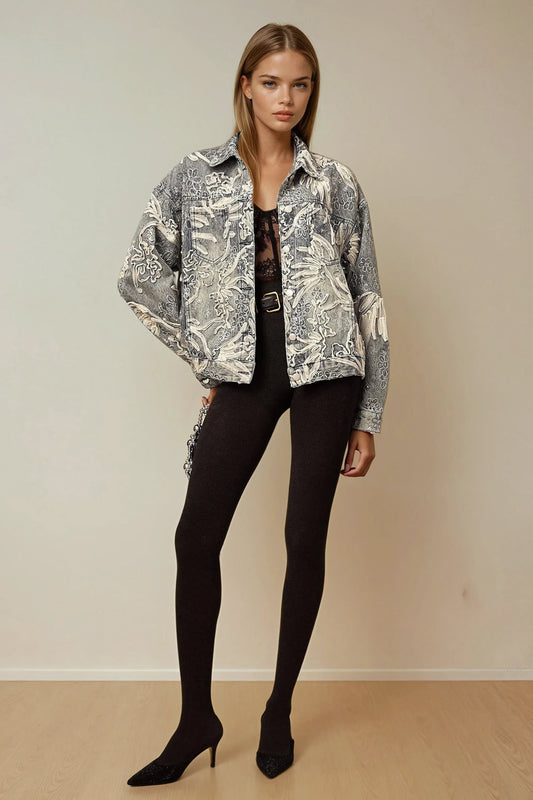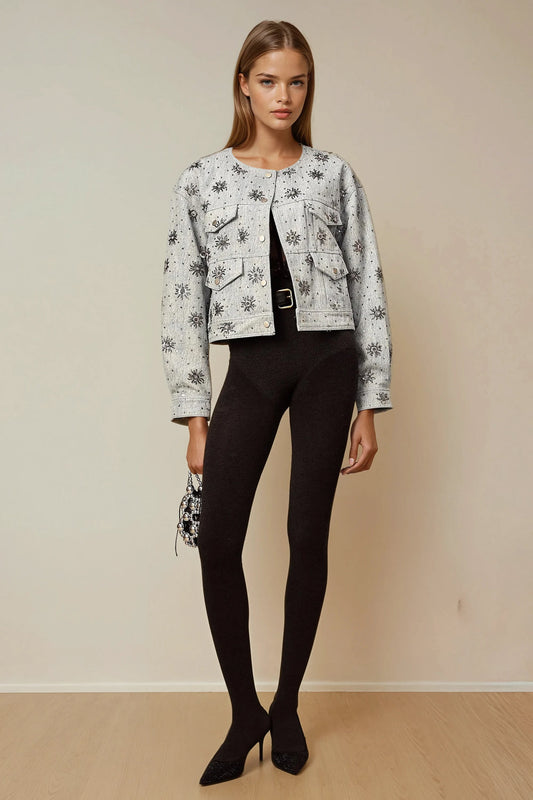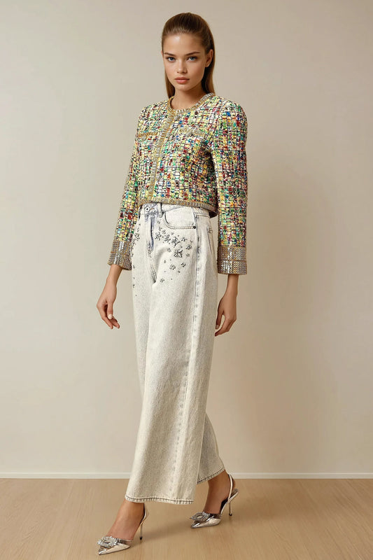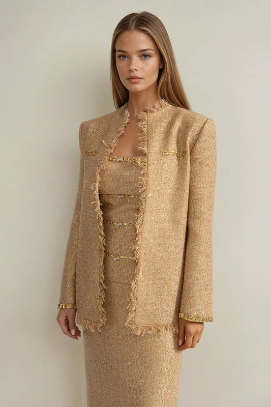 Cropped Jacket with Beaded Trim and Woven Texture - Gold