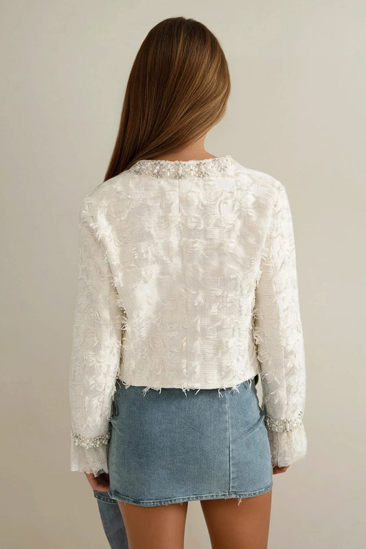 Cropped Jacket with Pearl Trim and Textured Finish - White
