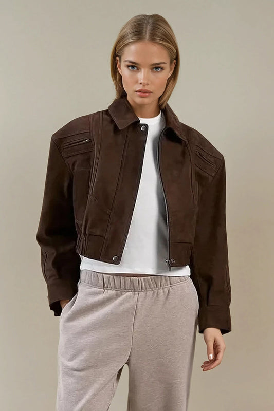 Zip Front Jacket with Collar and Cuff Details - Brown