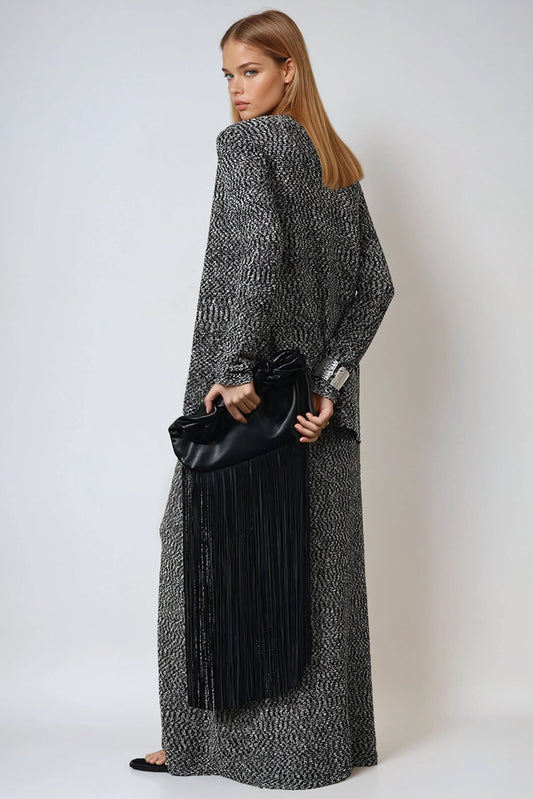 Fringed Belted Coat with Western-Inspired Pattern - Black