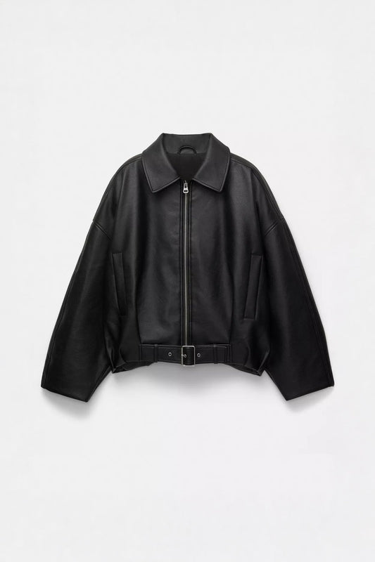 Zip-Up Jacket with Belt and Wide Sleeves - Black
