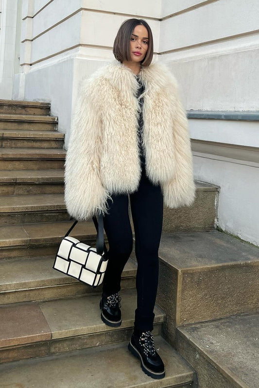 Natural Mongolian Sheepskin Coat with Lapels - Apricot
