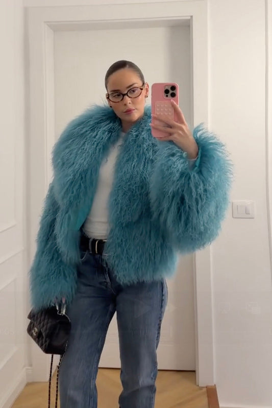 Natural Mongolian Sheepskin Coat with Lapels - Blue