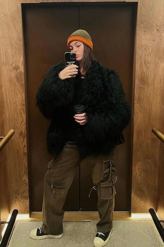 Natural Mongolian Sheepskin Coat with Lapels - Black