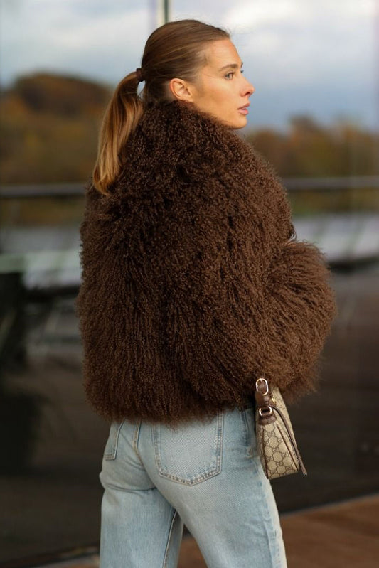Natural Mongolian Sheepskin Coat with Lapels - Brown