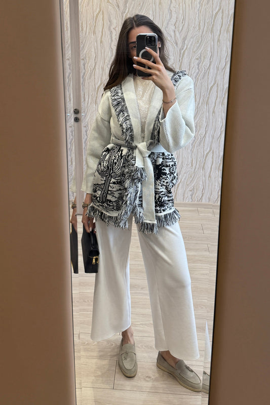 Fringed Belted Coat with Western-Inspired Pattern - White