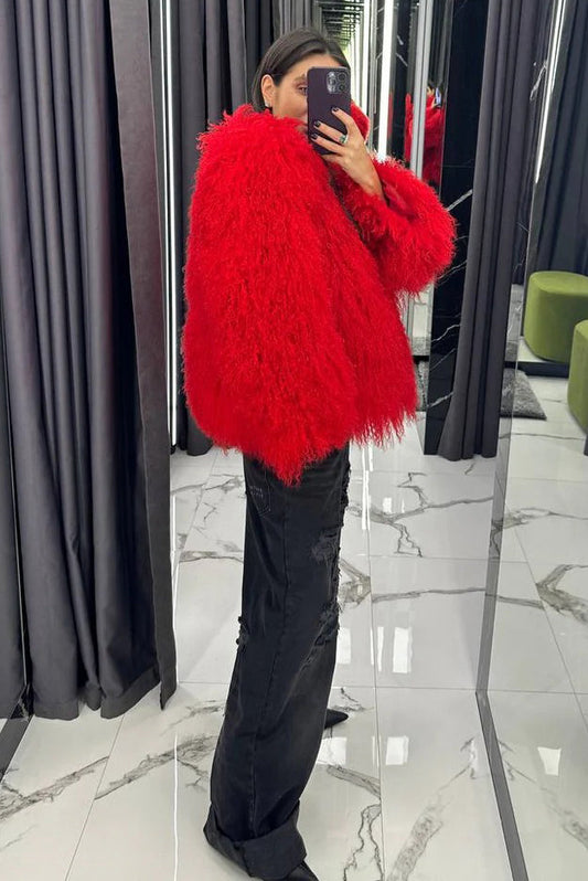 Natural Mongolian Sheepskin Coat with Lapels - Red