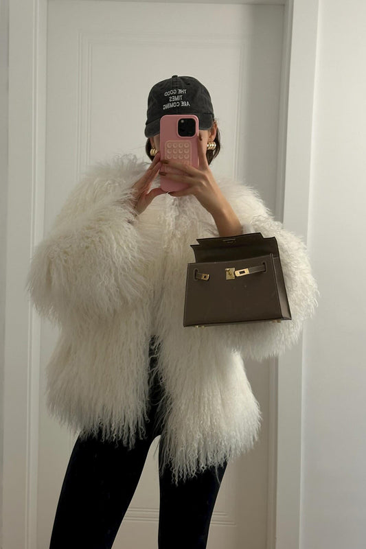 Natural Mongolian Sheepskin Coat with Lapels - White