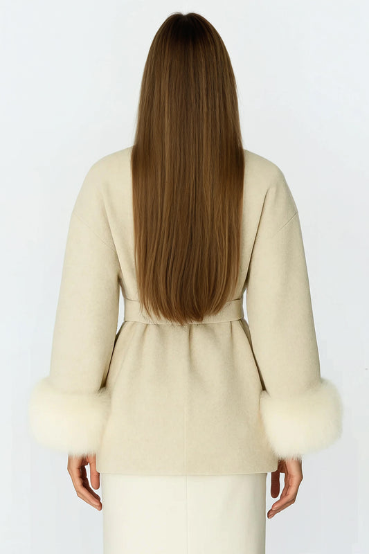 100% Wool Belted Coat with Fur Cuffs - Off White