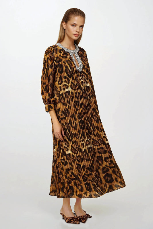 Embellished Pleated Maxi Dress with Keyhole Detail - Yellow
