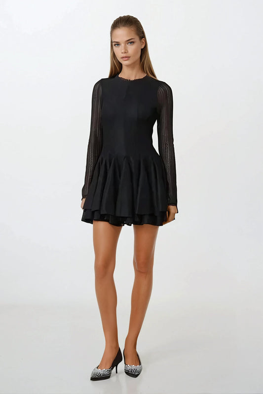 Long Sleeve Pleated Skirt Mini Dress - Black