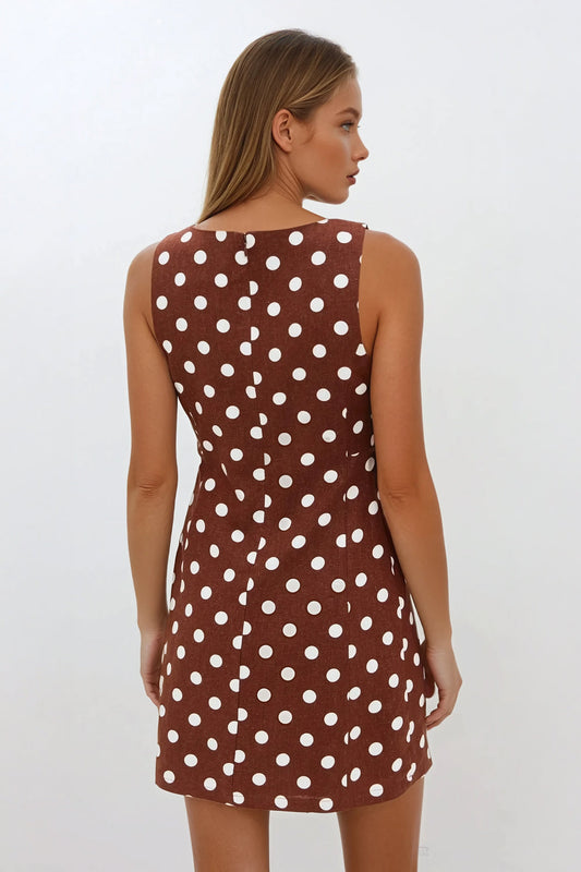 Polka Dot Sleeveless Mini Dress with Round Neckline - Brown