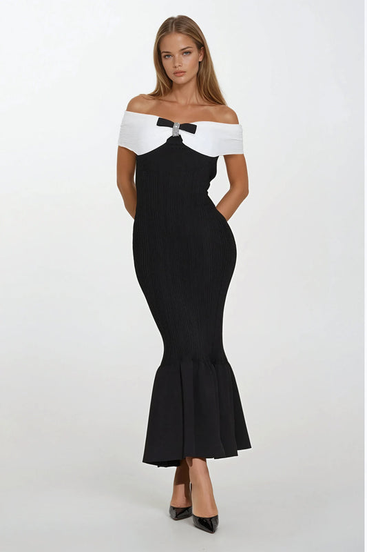 Off-Shoulder with Bow Detail Midi Dress - Black