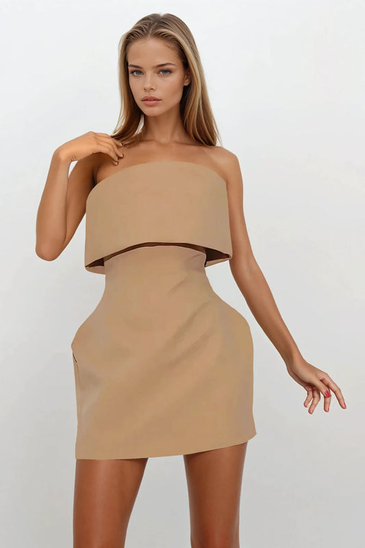 Ruffled Boat Neckline Mini Dress with Ribbon Shoulder Accent - Apricot